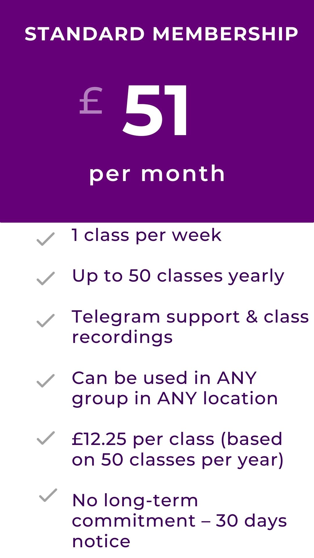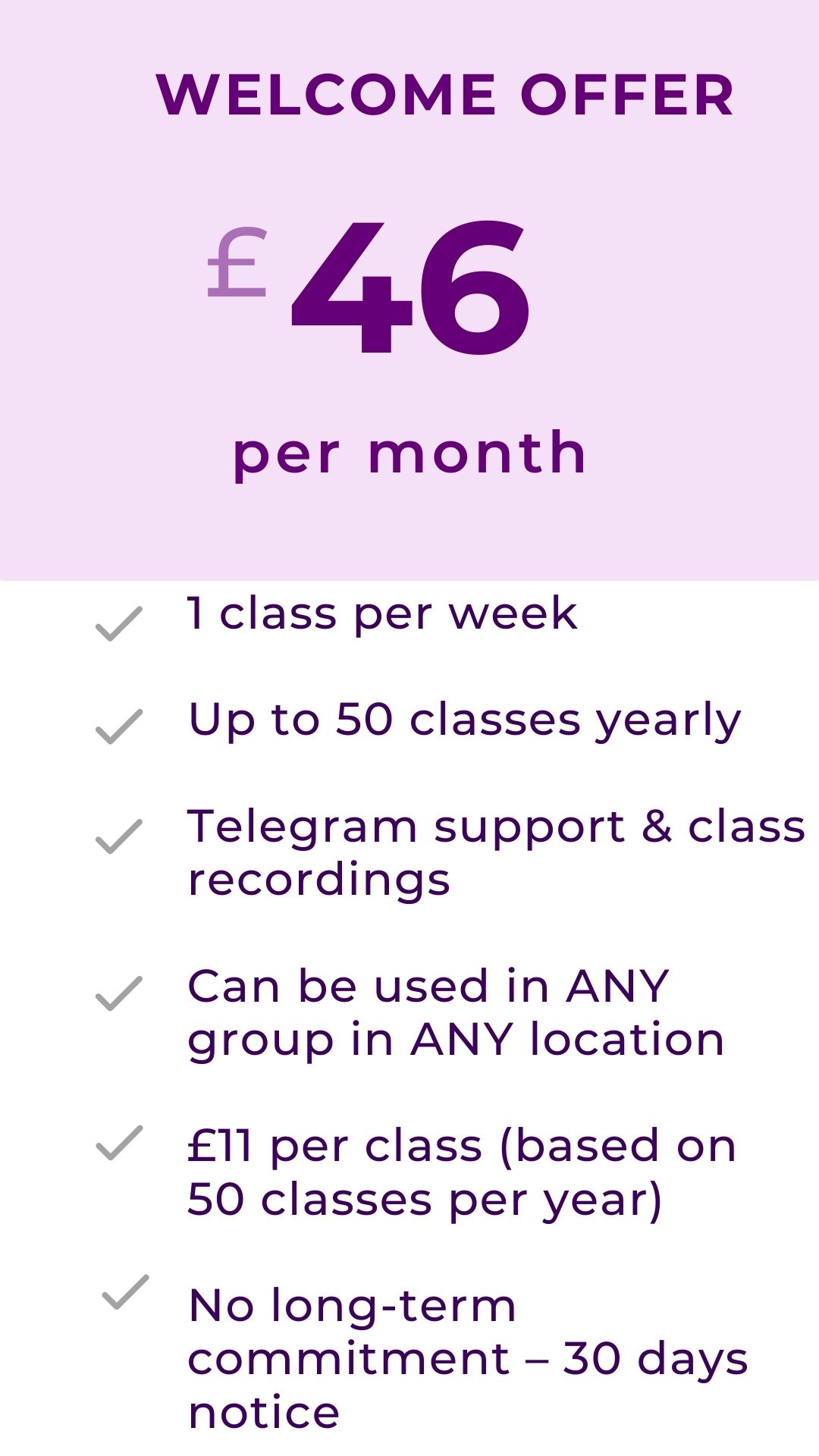 £61/month – a flexible option for dancers with changing schedules. Allows attending different locations or levels by prior arrangement, subject to availability. This membership is valid for 2 months. To book this option please contact us on Whatsapp 07424069357