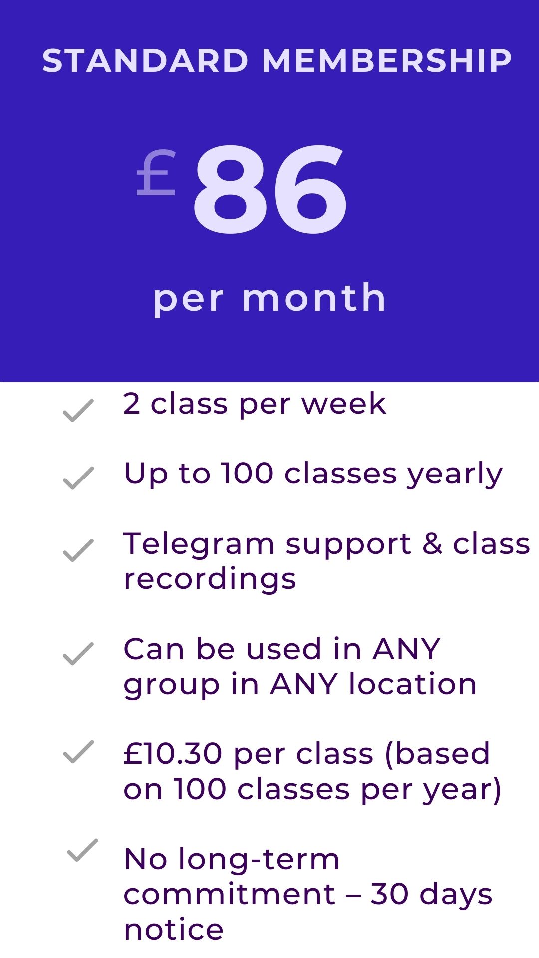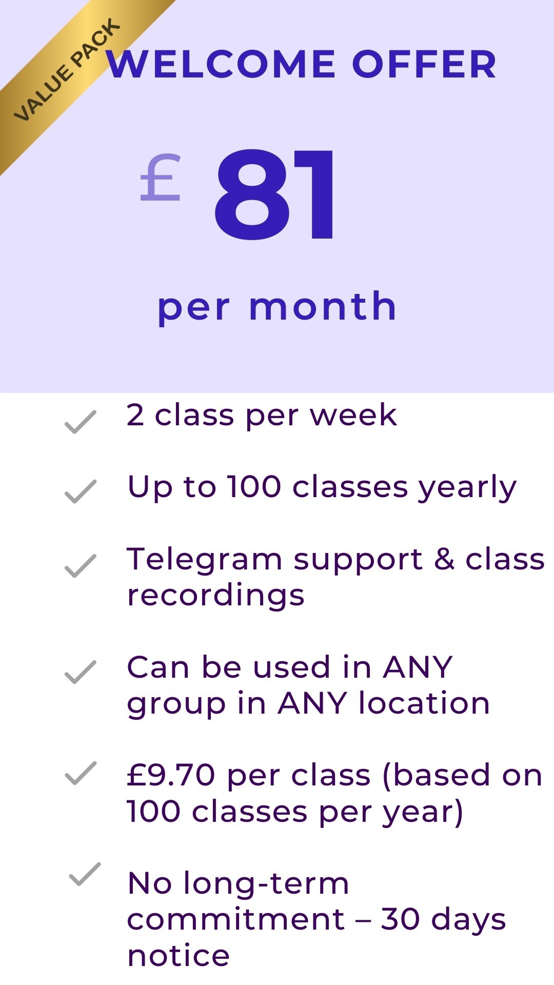 £61/month – a flexible option for dancers with changing schedules. Allows attending different locations or levels by prior arrangement, subject to availability. This membership is valid for 2 months. To book this option please contact us on Whatsapp 07424069357